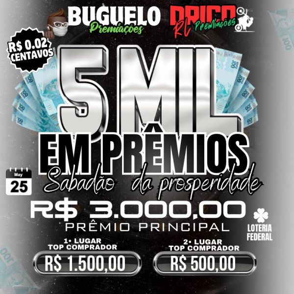 SABADÃO DA PROSPERIDADE POR APENAS R$ 0,02 CENTAVOS VOCÊ CONCORRERÁ À R$5,000 MIL REIAS EM PRÊMIOS SENDO R$3,000 MIL PRIMEIRO PRÊMIO LOTERIA FEDERAL E $1,500,00 PARA O TOP COMPRADOR, COMPROU MAIS COTAS LEVA $1,500,00 PRIMEIRO LUGAR SEGUNDO LUGAR LEVA $500,00 NO TOP COMPRADOR TOTALIZANDO 5 MIL EM PRÊMIOS ✅